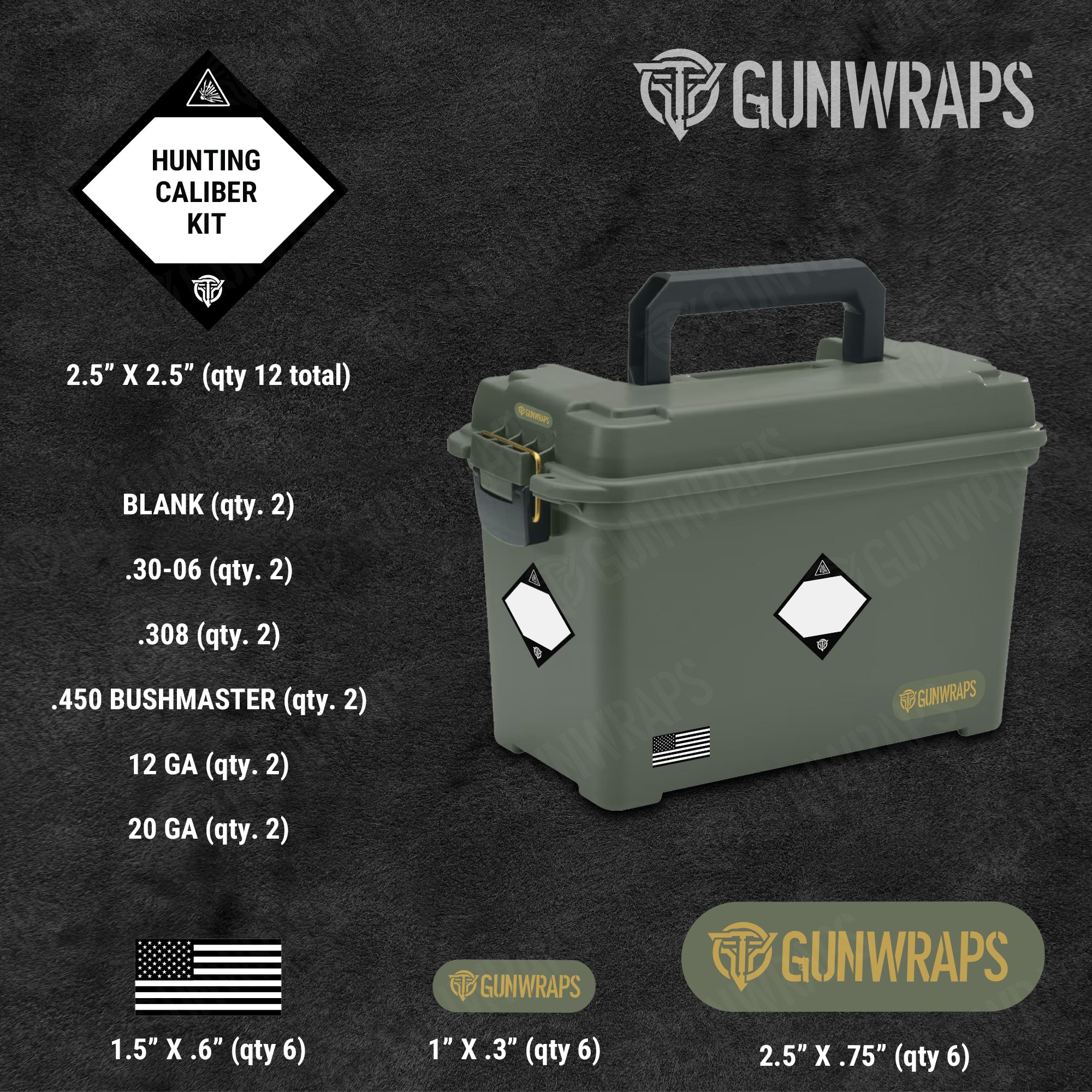 GunWraps ammo can labels are high-quality premium stickers with a clean matte finish. Keep organized with these easy-to-identify ammo can stickers that come in various calibers and options, such as hunting ammo, pistol ammo, long-rifle ammo, assault rifle ammo, and much more. Buy more, and save more by purchasing multiple ammo can stickers with your order.